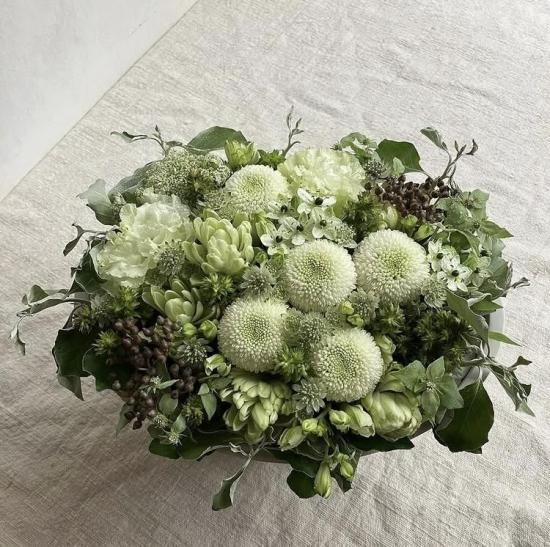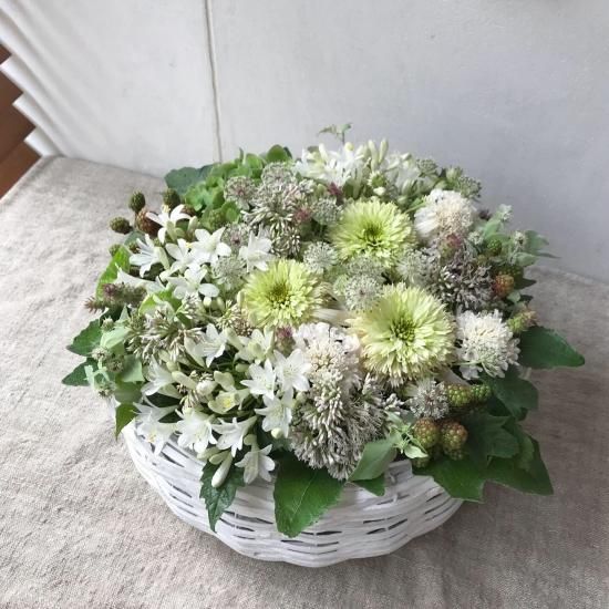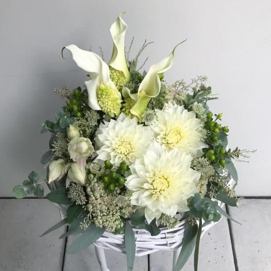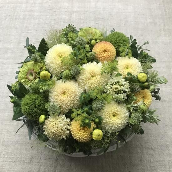(一般的にバラの使用はNGとされています。基本的に菊やダリアやカラー、季節により球根花(チューリップやラナンキュラスなど)を使用いたしますが、ご要望がありましたら備考欄にご入力ください。)